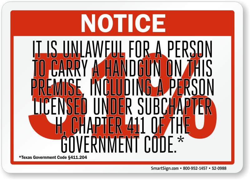 - The Generic “No Guns” Sign (Legally Unenforceable in Texas): You have seen this sign. It is the universal red circle with a handgun silhouette and a slash through it. It is on grocery store doors, gas stations, and restaurant entrances across Texas. It’s decorative and unenforceable.