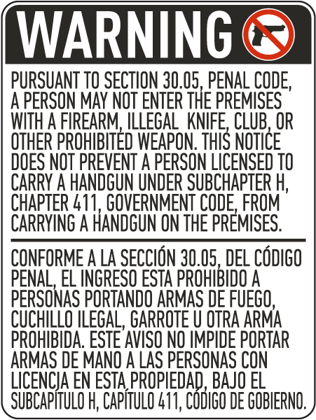 - 30.05 (Restricts Permitless Carriers Only): A 30.05 sign tells unlicensed carriers they cannot enter with a firearm. If a business posts only a 30.05 sign, Texas LTC holders are not restricted by it. The sign was created specifically by HB 1927 in 2021 to give property owners a tool to exclude unlicensed carry without affecting LTC holders. If you have your LTC and the business only has a 30.05 sign, you have a carry option that a permitless carrier does not. Violating a 30.05 sign as a permitless carrier is a Class C misdemeanor (a fine of up to $200) unless oral notice was given to leave, which escalates it significantly.