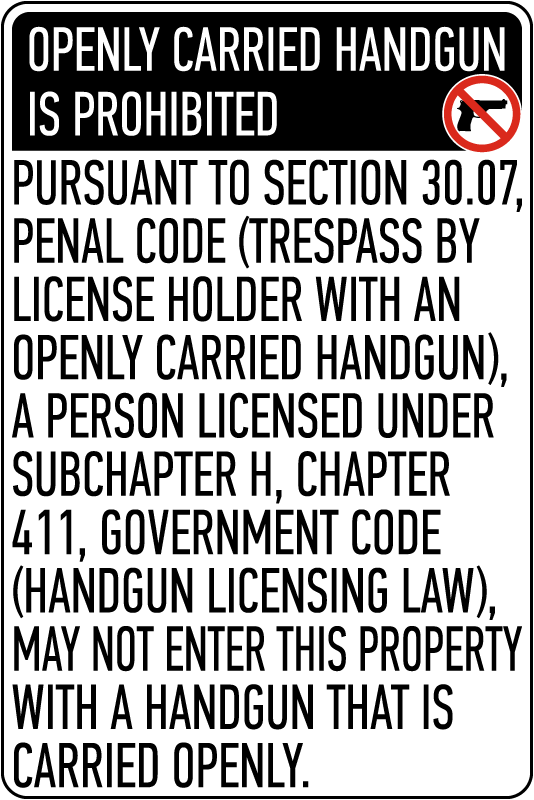 - 30.07 (Restricts LTC Open Carry): A 30.07 sign restricts LTC holders from open carrying on that property. Again, permitless carriers are not specifically named by this sign. If a business posts both 30.06 and 30.07, LTC holders are restricted from both concealed and open carry on those premises.